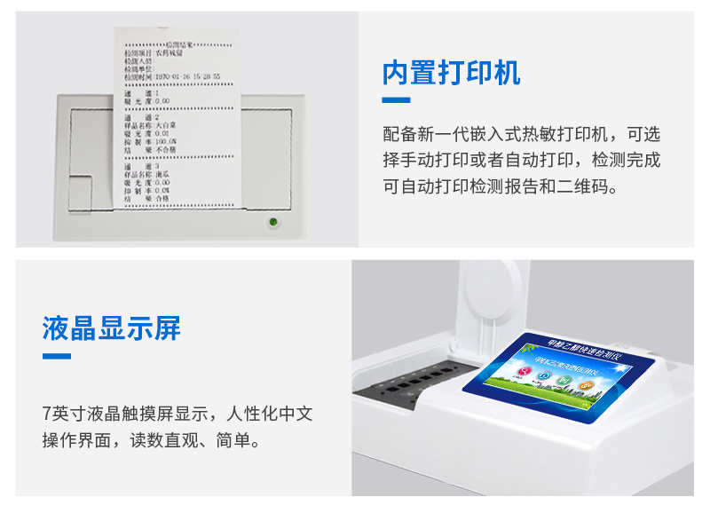 儀器采用臺(tái)式一體化系統(tǒng)檢測技術(shù),將分光光度模塊、新型農(nóng)殘檢測模塊、數(shù)字化管理模塊、無線通訊模塊高度集成于一體,支持檢測200種食品安全檢測項(xiàng)目,同時(shí)預(yù)留升級(jí)檢測方法。儀器檢測模塊標(biāo)準(zhǔn)化、智能化,可隨意自由組合。檢測箱體內(nèi)置多個(gè)標(biāo)準(zhǔn)檢測單元,檢測模塊可以調(diào)整配置。儀器采用全新安卓智能系統(tǒng),主控芯片采用 ARM Cortex-A7,RK3288/4核處理器,10.1寸高清液晶觸摸豎屏,更加**的UI交互界面,運(yùn)轉(zhuǎn)快捷;儀器配備無線通信模塊: 4G(APN)通訊模塊、Wifi模塊,藍(lán)牙傳輸,同時(shí)具有雙USB接口以及RJ45接口能以多種方式實(shí)現(xiàn)數(shù)據(jù)保存和數(shù)據(jù)傳輸功能。創(chuàng)新檢測模式:★檢測通道:≥12通道;采用精密旋轉(zhuǎn)比色池設(shè)計(jì),使用同芯片同光源校準(zhǔn)精度,解決不同光源之間的誤差值。1-12通道間誤差0.1%。(***:**202022821055.2)★儀器具有自動(dòng)識(shí)別比色皿檢測功能,即:將樣品比色皿放入儀器后,點(diǎn)擊樣品檢測,儀器自動(dòng)識(shí)別比色皿進(jìn)行通道檢測。進(jìn)口高精光源:高精度進(jìn)口四波長冷光源,通道配置 410、520、590、630nm 波長光源,一個(gè)光源芯片驅(qū)動(dòng)一個(gè)光源,誤差極小,每臺(tái)設(shè)備單獨(dú)**校準(zhǔn)光源,**比對,同時(shí)參照四種不同波段光源全方位覆蓋市面上99%的農(nóng)殘食品項(xiàng)目檢測。智能化操作系統(tǒng):便捷操作系統(tǒng):設(shè)備檢測時(shí)可在同一檢測界面自動(dòng)對應(yīng)相關(guān)檢測通道一次性選擇1-12個(gè)樣品名稱,無須退出界面,節(jié)省操作時(shí)間。數(shù)據(jù)集成系統(tǒng):設(shè)備首頁自動(dòng)統(tǒng)計(jì)檢測數(shù)據(jù)包含:周檢測數(shù)據(jù)、月檢測數(shù)據(jù),全部檢測總數(shù)量,均包含檢測總數(shù),合格數(shù),不合格數(shù),以及相關(guān)柱形分析圖,對各項(xiàng)檢測數(shù)據(jù)清晰掌握,無需電腦查詢,更加快捷直觀。項(xiàng)目預(yù)設(shè)系統(tǒng):支持添加單個(gè)及多個(gè)相同或不相同的任務(wù)預(yù)設(shè),一鍵快速調(diào)取,每一個(gè)任務(wù)分別可以設(shè)置不同的樣品、批次、編號(hào)、來源、備注、抽樣信息、檢測信息、受檢信息、復(fù)核信息等更多信息。無縫鏈接平臺(tái)和APP實(shí)時(shí)查看下發(fā)任務(wù)。數(shù)據(jù)監(jiān)管系統(tǒng):同步對接監(jiān)管平臺(tái),數(shù)據(jù)可局域網(wǎng)和互聯(lián)網(wǎng)數(shù)據(jù)上傳,檢測結(jié)果可選擇直接傳至食品安全監(jiān)管平臺(tái)。集成OSS輸出存儲(chǔ)服務(wù)、區(qū)分設(shè)備定向管理應(yīng)用,進(jìn)行區(qū)域食品安全監(jiān)管及大數(shù)據(jù)分析處理與數(shù)據(jù)統(tǒng)計(jì),檢測區(qū)域食品安全長短期動(dòng)態(tài),達(dá)到食品安全問題預(yù)估、預(yù)警。自定義打印系統(tǒng):內(nèi)置全新打印系統(tǒng),新創(chuàng)自定義打印方式,可按需靈活設(shè)置開啟或關(guān)閉:產(chǎn)品合格證(國家農(nóng)業(yè)部標(biāo)準(zhǔn)要求),二維碼,抽樣信息、檢測信息,受檢信息、復(fù)核信息、抽樣日期、檢測日期等信息的打印。系統(tǒng)遠(yuǎn)程更新功能:可定向分客戶分儀器更新系統(tǒng),按照不同客戶后期實(shí)際需求添加項(xiàng)目,無需機(jī)器返廠,即可遠(yuǎn)程實(shí)時(shí)升級(jí)全新系統(tǒng),節(jié)省時(shí)間成本及避免運(yùn)輸造成設(shè)備損壞。儀器主機(jī)采用一體化防水、抗壓、防撞擊、防腐蝕箱體設(shè)計(jì),同時(shí)配備交直流供電,可連接車載電源,可選配大容量充電鋰電池,滿足現(xiàn)場野外檢測需求。安全證書,放心保障:儀器具有中國計(jì)量科學(xué)研究院校準(zhǔn)證書,權(quán)威認(rèn)證。