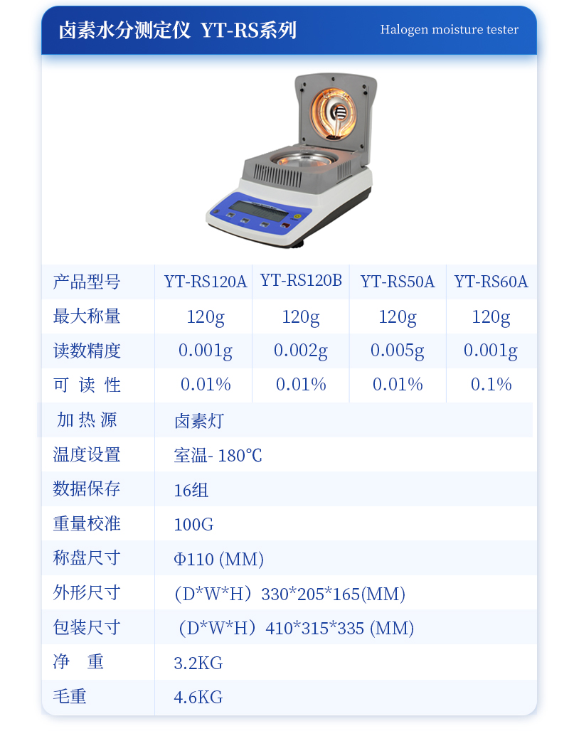 型號 :YT-RS120A,**稱量值:120g ,顯示分度值:0.001g,可  讀  性 :0.01%型號 : YT-RS120B,**稱量值:120g ,顯示分度值: 0.002g ,可  讀  性 :0.01%型號 : YT-RS50A,**稱量值:120g ,顯示分度值: 0.005g ,可  讀  性 :0.01%型號 : YT-RS60A,**稱量值:120g ,顯示分度值: 0.01g ,可  讀  性 :0.1%加 熱 源 鹵素?zé)?  溫度設(shè)置 室溫- 180℃數(shù)據(jù)保存 16組   重量校準(zhǔn) 100g稱盤尺寸  φ110 (mm)外形尺寸 (D*W*H)330*205*165(mm)包裝尺寸 (D*W*H)410*315*335 (mm)凈    重 3.2kg  毛    重 4.6kg