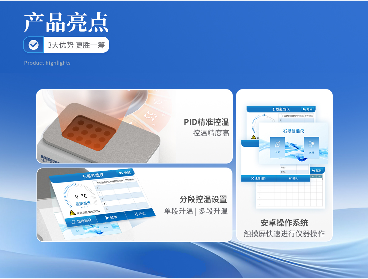 使用5寸彩色觸摸屏進(jìn)行儀器操作,配備安卓操作系統(tǒng),方便快捷。    采用PID 控溫技術(shù),控溫精度高,升溫速度快, 從室溫到260℃僅需25分鐘。    分段控溫設(shè)置,即可單段升溫,也可多段升溫,設(shè)置靈活,儀器將自動(dòng)按順序完成。更適于易產(chǎn)生泡沫的樣品。    采用優(yōu)質(zhì)石墨爐內(nèi)芯,平均溫差較小,樣品效果一致性好,熱傳導(dǎo)效率更高。石墨塊具有特氟龍涂層,耐腐蝕,延長(zhǎng)使用壽命。