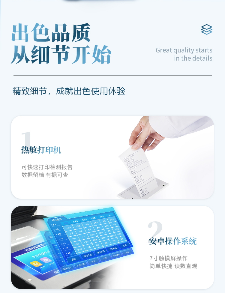 | 安卓智能操作系統(tǒng),采用更加**和人性化操作,儀器具有無線聯(lián)網(wǎng)上傳功能,快速上傳數(shù)據(jù),進(jìn)行數(shù)據(jù)統(tǒng)計和分析。 | 智能化程度高,儀器具有自檢功能:具有開機自檢和調(diào)零功能,具有自動檢測重復(fù)性功能;同時,檢測完成可自動打印檢測報告和二維碼。手機掃碼可顯示出詳細(xì)檢測信息。 | 儀器帶有監(jiān)管平臺,數(shù)據(jù)可局域網(wǎng)和互聯(lián)網(wǎng)數(shù)據(jù)上傳,檢測結(jié)果直接傳至食品安全監(jiān)管平臺。進(jìn)行區(qū)域食品安全監(jiān)管及大數(shù)據(jù)分析處理與數(shù)據(jù)統(tǒng)計,檢測區(qū)域食品安全長短期動態(tài),達(dá)到食品安全問題預(yù)估、預(yù)警 。 | 樣品處理簡單省力,整體操作快速、安全、便捷。 | 儀器具有自身保護(hù)功能,可設(shè)置用戶名及密碼,防止非工作人員操作等。 | 內(nèi)置強大的數(shù)據(jù)庫,可在儀器上直接選擇樣品名稱、檢測指標(biāo)、送檢單位等信息,也可在儀器上直接編輯錄入樣品名稱、檢測指標(biāo)、送檢單位等信息并保存進(jìn)樣品數(shù)據(jù)庫,方便后期操作調(diào)取使用。 | 儀器具有重新校準(zhǔn)、鎖定、恢復(fù)出廠設(shè)置功能。 |