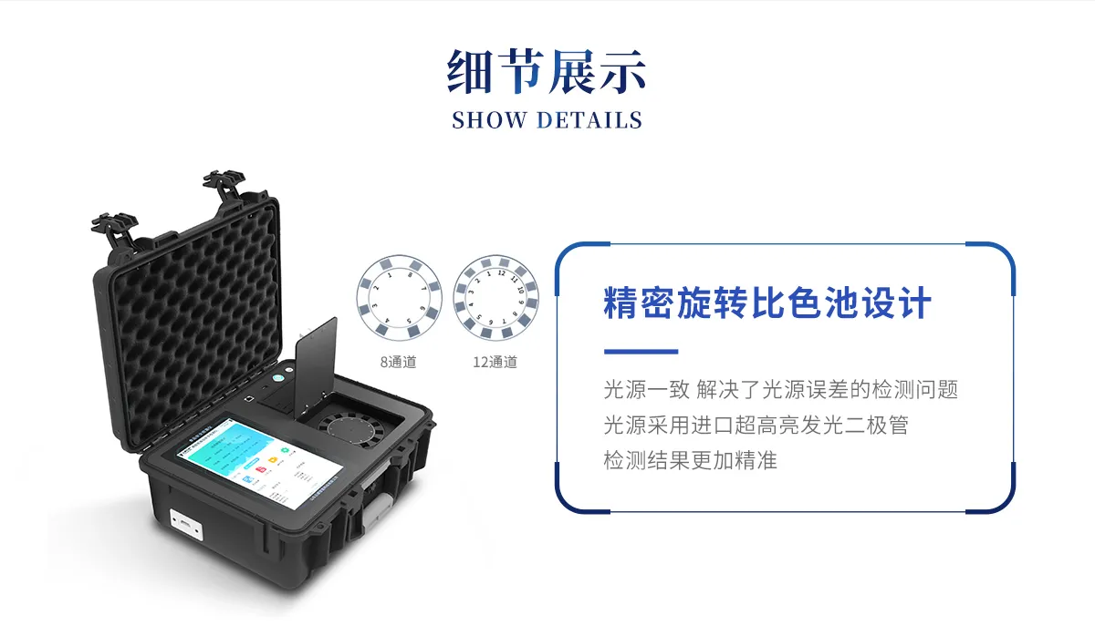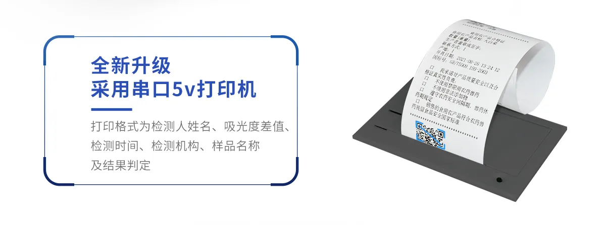 | 儀器采用手提式一體化系統(tǒng)檢測(cè)技術(shù),將分光光度模塊、膠體金檢測(cè)模塊、新型農(nóng)殘檢測(cè)模塊、數(shù)字化管理模塊、無線通訊模塊高度集成于一體,支持檢測(cè)200種食品安全檢測(cè)項(xiàng)目,同時(shí)預(yù)留升級(jí)檢測(cè)方法。 | 儀器檢測(cè)模塊標(biāo)準(zhǔn)化、智能化,檢測(cè)項(xiàng)目可隨意自由組合。檢測(cè)箱體內(nèi)置多個(gè)標(biāo)準(zhǔn)檢測(cè)單元,檢測(cè)模塊可以調(diào)整配置。 | 顯示屏幕:儀器采用10.1英寸豎向液晶觸摸屏顯,搭配運(yùn)行安卓智能操作系統(tǒng),主控芯片采用ARM Cortex-A7,RK3288/4核處理器,主頻1.88Ghz,操作方便,性能更強(qiáng)。 | 檢測(cè)通道:≥12通道;采用精密旋轉(zhuǎn)比色池設(shè)計(jì),使用同芯片同光源校準(zhǔn)精度,解決不同光源之間的誤差值,更加準(zhǔn)確**。(1-12通道間誤差0.1%,***:**202022821055.2) | 儀器光源:高精度進(jìn)口四波長冷光源,每個(gè)通道均配置 410、520、590、630nm 波長光源,標(biāo)配**的光路切換裝置,專利光路切換功能可實(shí)現(xiàn)64波長,并且所有檢測(cè)項(xiàng)目可實(shí)現(xiàn)所有通道同時(shí)檢測(cè)。 | 設(shè)備可一鍵校準(zhǔn),自動(dòng)保存校準(zhǔn)數(shù)據(jù),自動(dòng)對(duì)比校驗(yàn),得到精準(zhǔn)光源,采用Android SP存儲(chǔ)數(shù)據(jù),光源數(shù)據(jù)永不丟失,方便每一次使用。 | 通訊接口:配備無線通信模塊、4G(APN)通訊模塊、藍(lán)牙傳輸,同時(shí)具有雙USB接口以及RJ45網(wǎng)線接口,可以多方式實(shí)現(xiàn)數(shù)據(jù)保存及數(shù)據(jù)傳輸。 | 存儲(chǔ)方式:支持U盤存儲(chǔ),標(biāo)準(zhǔn)USB接口,免驅(qū)動(dòng)安裝。檢測(cè)結(jié)果存儲(chǔ)容量20萬條以上,可生成Excel表格進(jìn)行拷貝,并具有登錄保護(hù)功能。 | 智能化操作系統(tǒng):: ★操作系統(tǒng):儀器可在同一檢測(cè)界面自動(dòng)對(duì)應(yīng)相關(guān)檢測(cè)通道,一次性選擇1-12個(gè)樣品名稱,無需退出界面,節(jié)省操作時(shí)間。并可以對(duì)每個(gè)通道屬性和樣品信息單獨(dú)進(jìn)行編輯,例如送檢單位、人員,檢測(cè)人員等,打印時(shí)勾選打印顯示。 | ★數(shù)據(jù)集成系統(tǒng):設(shè)備首頁自動(dòng)匯總分析檢測(cè)數(shù)據(jù),包含:周檢測(cè)數(shù)據(jù)、月檢測(cè)數(shù)據(jù),全部檢測(cè)總數(shù)量,均包含檢測(cè)總數(shù),合格數(shù),不合格數(shù),以及相關(guān)柱形分析圖,各項(xiàng)檢測(cè)數(shù)據(jù)一目了然,無需電腦查詢,更加快捷直觀。 | ★數(shù)據(jù)庫系統(tǒng):十幾項(xiàng)數(shù)據(jù)庫分類管理儀器:包含項(xiàng)目類型、項(xiàng)目數(shù)據(jù)、檢測(cè)數(shù)據(jù)、歷史記錄、國標(biāo)信息、曲線信息、采樣信息、檢測(cè)信息、受檢信息、復(fù)核信息、圖表信息、光源校準(zhǔn)信息、打印樣式信息、樣品庫信息等等,數(shù)據(jù)庫之間互相協(xié)調(diào)聯(lián)動(dòng)保證數(shù)據(jù)的真實(shí)完整性。同時(shí)產(chǎn)品數(shù)據(jù)庫以及歷史檢測(cè)記錄支持一鍵檢索功能。 | ★限量規(guī)判系統(tǒng):具有限量查詢、添加物質(zhì)合規(guī)判定系統(tǒng)。檢測(cè)出結(jié)果后,系統(tǒng)自動(dòng)調(diào)用系統(tǒng)數(shù)據(jù)庫中相關(guān)國標(biāo)進(jìn)行比對(duì)判定,客觀顯示判定結(jié)果是否合格 | ★項(xiàng)目預(yù)設(shè)系統(tǒng):儀器具有任務(wù)預(yù)設(shè)模塊,一鍵提前預(yù)設(shè),給出方便快捷的新檢測(cè)方案,每一個(gè)任務(wù)分別可以設(shè)置不同的樣品、批次、編號(hào)、來源、備注、抽樣信息、檢測(cè)信息、受檢信息、復(fù)核信息等更多信息。樣品送檢時(shí)一鍵調(diào)取保存信息,并可多次調(diào)取,大大提高檢測(cè)效率。 | ★數(shù)據(jù)監(jiān)管系統(tǒng):同步對(duì)接監(jiān)管平臺(tái),數(shù)據(jù)可局域網(wǎng)和互聯(lián)網(wǎng)數(shù)據(jù)上傳,檢測(cè)結(jié)果可選擇直接傳至食品安全監(jiān)管平臺(tái)。進(jìn)行區(qū)域食品安全監(jiān)管及大數(shù)據(jù)分析處理與數(shù)據(jù)統(tǒng)計(jì),檢測(cè)區(qū)域食品安全長短期動(dòng)態(tài),達(dá)到食品安全問題預(yù)估、預(yù)警。 | ★打印系統(tǒng):內(nèi)置全新打印機(jī),新創(chuàng)自定義打印方式,可按需靈活勾選控制:產(chǎn)品合格證(國家農(nóng)業(yè)部標(biāo)準(zhǔn)要求),二維碼,抽樣信息、檢測(cè)信息,受檢信息、復(fù)核信息、抽樣日期、檢測(cè)日期等信息的打印。 | 供電模式:儀器交直流兩用,直流12V供電,可連接車載電源,可配6ah大容量充電鋰電池,電量可實(shí)時(shí)顯示,方便戶外流動(dòng)測(cè)試。 | 膠體金檢測(cè)模塊:采用雙通道CMOS成像處理技術(shù)及膠體金免疫層析技術(shù),可同時(shí)讀取雙膠體金卡數(shù)據(jù),自動(dòng)采集、處理分析,將檢測(cè)結(jié)果顯示,并可根據(jù)參考限值自動(dòng)判斷檢測(cè)結(jié)果,可檢測(cè)常見的獸藥殘留、生物毒素、抗生素、違禁添加物等。 | ★探測(cè)技術(shù):CMOS成像探測(cè); | ★檢測(cè)通道:1個(gè)通道; | ★檢測(cè)方式:消線法和比色法; | ★顯示模式:陰性或陽性; | ★曲線形式:軌道式掃描方式,顯示金標(biāo)卡圖像,實(shí)時(shí)生成、識(sh