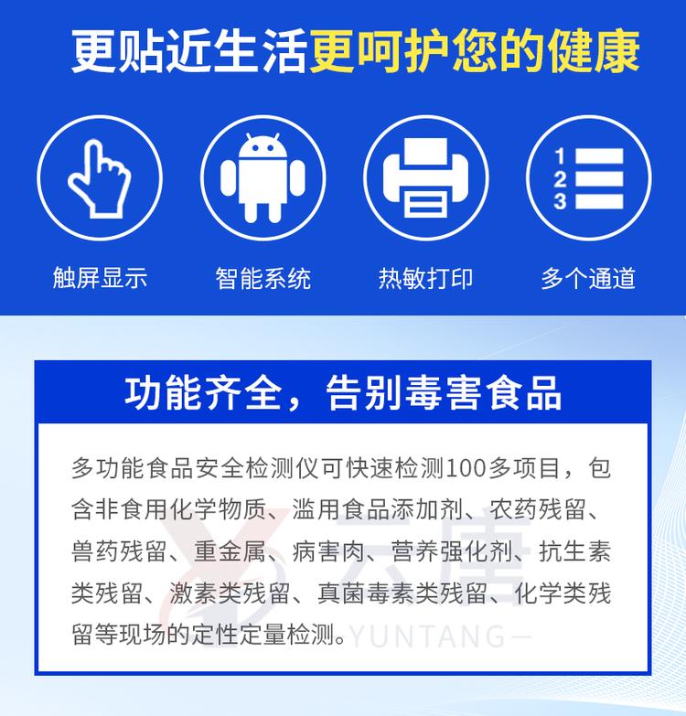 | 儀器采用臺式一體化系統(tǒng)檢測技術(shù),將分光光度模塊、新型農(nóng)殘檢測模塊、數(shù)字化管理模塊、無線通訊模塊高度集成于一體,支持檢測200種食品安全檢測項目,同時預(yù)留升級檢測方法。 | 儀器檢測模塊標(biāo)準(zhǔn)化、智能化,可隨意自由組合。檢測箱體內(nèi)置多個標(biāo)準(zhǔn)檢測單元,檢測模塊可以調(diào)整配置。 | 儀器采用全新安卓智能系統(tǒng),主控芯片采用 ARM Cortex-A7,RK3288/4核處理器,10.1寸高清液晶觸摸豎屏,更加**的UI交互界面,運轉(zhuǎn)快捷;儀器配備無線通信模塊: 4G(APN)通訊模塊、Wifi模塊,藍(lán)牙傳輸,同時具有雙USB接口以及RJ45接口能以多種方式實現(xiàn)數(shù)據(jù)保存和數(shù)據(jù)傳輸功能。 | 創(chuàng)新檢測模式: | ★檢測通道:≥12通道;采用精密旋轉(zhuǎn)比色池設(shè)計,使用同芯片同光源校準(zhǔn)精度,解決不同光源之間的誤差值。1-12通道間誤差0.1%。(***:**202022821055.2) | ★儀器具有自動識別比色皿檢測功能,即:將樣品比色皿放入儀器后,點擊樣品檢測,儀器自動識別比色皿進(jìn)行通道檢測。 | 進(jìn)口高精光源: | 高精度進(jìn)口四波長冷光源,通道配置 410、520、590、630nm 波長光源,一個光源芯片驅(qū)動一個光源,誤差極小,每臺設(shè)備單獨**校準(zhǔn)光源,**比對,同時參照四種不同波段光源全方位覆蓋市面上99%的農(nóng)殘食品項目檢測。 | 智能化操作系統(tǒng): | 便捷操作系統(tǒng):設(shè)備檢測時可在同一檢測界面自動對應(yīng)相關(guān)檢測通道一次性選擇1-12個樣品名稱,無須退出界面,節(jié)省操作時間。 | 數(shù)據(jù)集成系統(tǒng):設(shè)備首頁自動統(tǒng)計檢測數(shù)據(jù)包含:周檢測數(shù)據(jù)、月檢測數(shù)據(jù),全部檢測總數(shù)量,均包含檢測總數(shù),合格數(shù),不合格數(shù),以及相關(guān)柱形分析圖,對各項檢測數(shù)據(jù)清晰掌握,無需電腦查詢,更加快捷直觀。 | 項目預(yù)設(shè)系統(tǒng):支持添加單個及多個相同或不相同的任務(wù)預(yù)設(shè),一鍵快速調(diào)取,每一個任務(wù)分別可以設(shè)置不同的樣品、批次、編號、來源、備注、抽樣信息、檢測信息、受檢信息、復(fù)核信息等更多信息。無縫鏈接平臺和APP實時查看下發(fā)任務(wù)。 | 數(shù)據(jù)監(jiān)管系統(tǒng):同步對接監(jiān)管平臺,數(shù)據(jù)可局域網(wǎng)和互聯(lián)網(wǎng)數(shù)據(jù)上傳,檢測結(jié)果可選擇直接傳至食品安全監(jiān)管平臺。集成OSS輸出存儲服務(wù)、區(qū)分設(shè)備定向管理應(yīng)用,進(jìn)行區(qū)域食品安全監(jiān)管及大數(shù)據(jù)分析處理與數(shù)據(jù)統(tǒng)計,檢測區(qū)域食品安全長短期動態(tài),達(dá)到食品安全問題預(yù)估、預(yù)警。 | 自定義打印系統(tǒng):內(nèi)置全新打印系統(tǒng),新創(chuàng)自定義打印方式,可按需靈活設(shè)置開啟或關(guān)閉:產(chǎn)品合格證(國家農(nóng)業(yè)部標(biāo)準(zhǔn)要求),二維碼,抽樣信息、檢測信息,受檢信息、復(fù)核信息、抽樣日期、檢測日期等信息的打印。 | 系統(tǒng)遠(yuǎn)程更新功能:可定向分客戶分儀器更新系統(tǒng),按照不同客戶后期實際需求添加項目,無需機(jī)器返廠,即可遠(yuǎn)程實時升級全新系統(tǒng),節(jié)省時間成本及避免運輸造成設(shè)備損壞。 | 儀器主機(jī)采用一體化防水、抗壓、防撞擊、防腐蝕箱體設(shè)計,同時配備交直流供電,可連接車載電源,可選配大容量充電鋰電池,滿足現(xiàn)場野外檢測需求。 | 安全證書,放心保障:儀器具有中國計量科學(xué)研究院校準(zhǔn)證書,權(quán)威認(rèn)證。 |