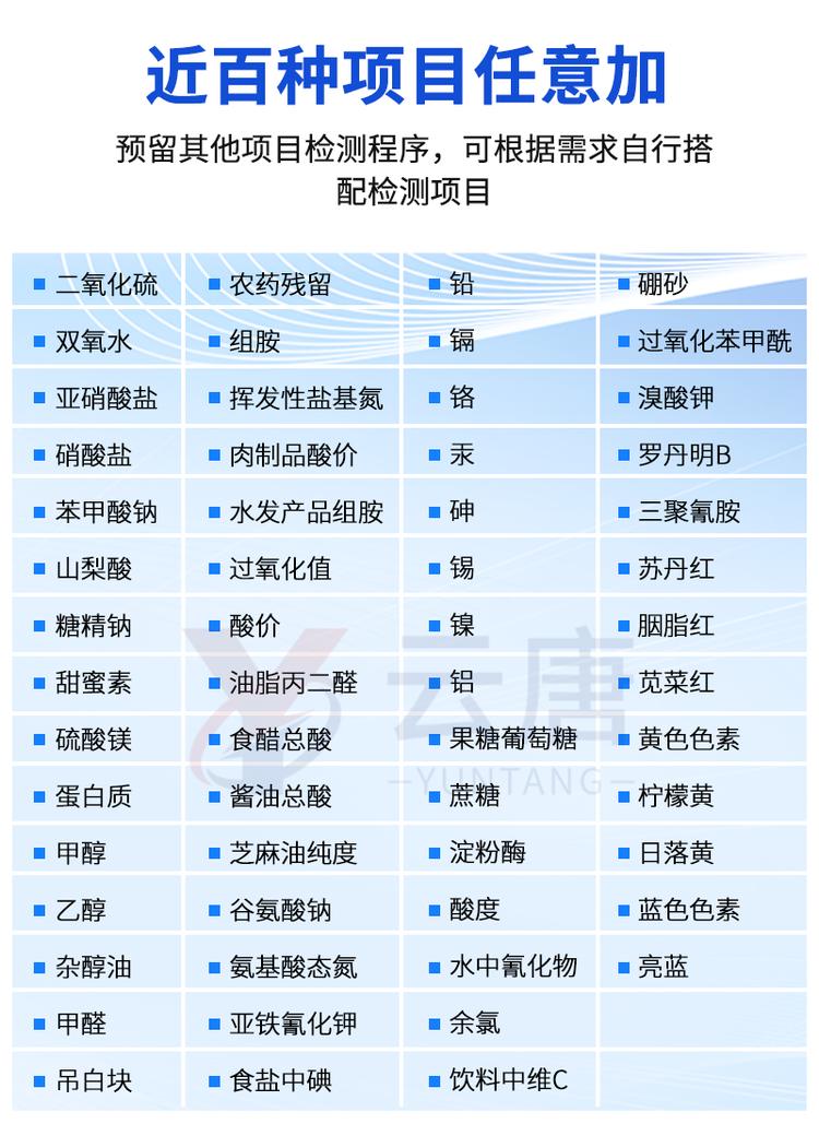 可快速檢測各類食品中、水中的尿素的含量,儀器預(yù)留其他項目檢測程序和端口,根據(jù)日后需求可方便的自主增加檢測項目。日后可升級為檢測,水產(chǎn)品,肉制品,面制品的綜合類型儀器。