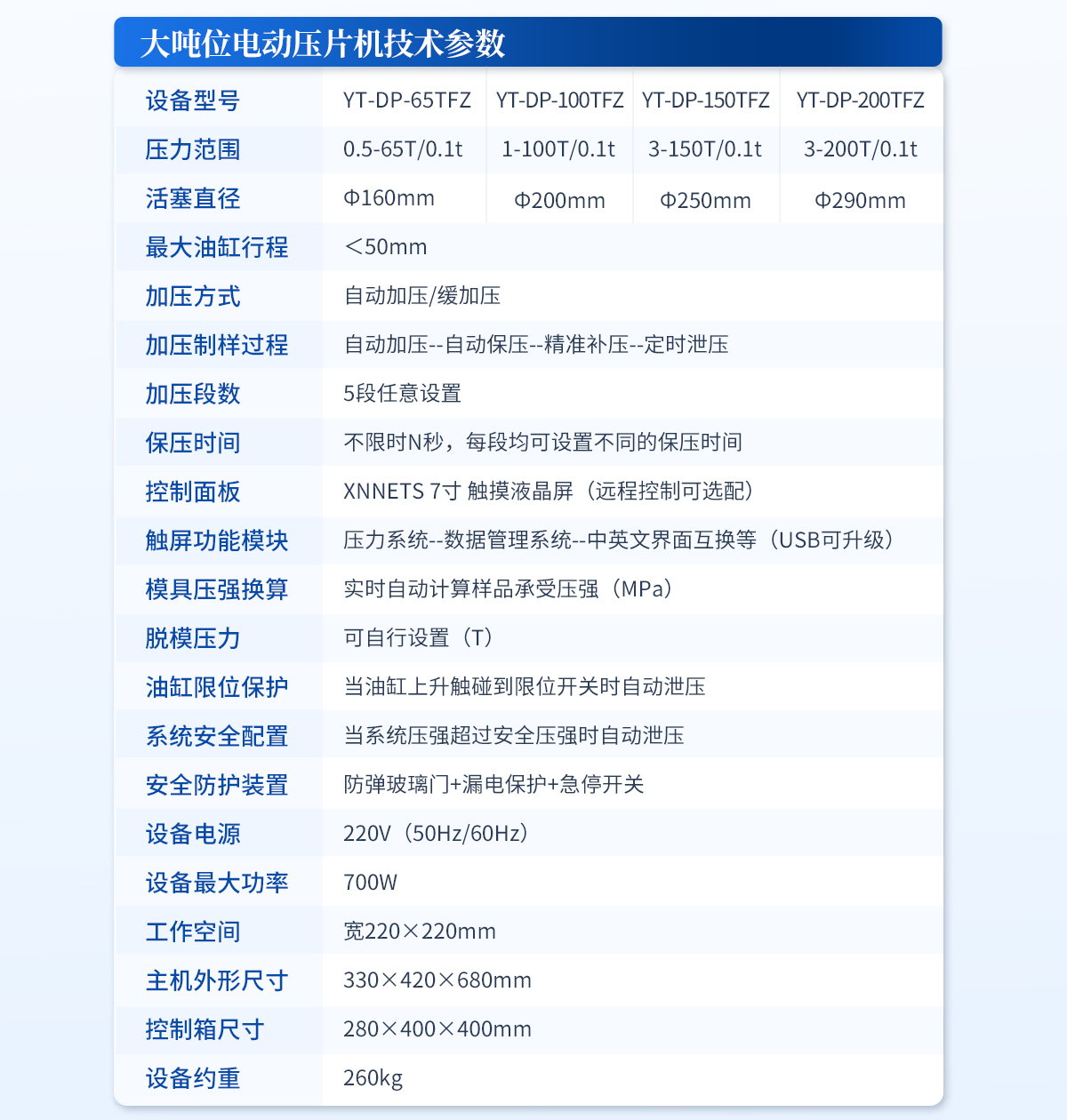 | 設(shè)備型號(hào):YT-DP-65TFZ | 壓力范圍:0.5-65T/0.1t | 油缸直徑:Φ160mm | 油缸行程 :<50mm | 加壓方式:自動(dòng)加壓/緩加壓 | 加壓制樣過(guò)程:自動(dòng)加壓--自動(dòng)保壓--精準(zhǔn)補(bǔ)壓--定時(shí)泄壓 | 加壓段數(shù):5段任意設(shè)置 | 保壓時(shí)間:不限時(shí)N秒,每段均可設(shè)置不同的保壓時(shí)間 | 控制面板:XNNETS 7寸 觸摸液晶屏(遠(yuǎn)程控制可選配) | 觸屏功能模塊:壓力系統(tǒng)--數(shù)據(jù)管理系統(tǒng)--中英文界面互換等(USB可升級(jí)) | 模具壓強(qiáng)換算:實(shí)時(shí)自動(dòng)計(jì)算樣品承受壓強(qiáng)(MPa) | 脫模壓力:可自行設(shè)置(T) | 油缸限位保護(hù):當(dāng)油缸上升觸碰到限位開(kāi)關(guān)時(shí)自動(dòng)泄壓 | 系統(tǒng)安全配置:當(dāng)系統(tǒng)壓強(qiáng)超過(guò)安全值時(shí)自動(dòng)泄壓 | 安全防護(hù)裝置:防彈玻璃門+漏電保護(hù)+急停開(kāi)關(guān) | 設(shè)備電源:220V(50Hz/60Hz) | 設(shè)備**功率:700W | 工作空間:寬220×220mm | 主機(jī)外形尺寸:330×420×680mm | 控制箱尺寸:280×400×400mm | 設(shè)備約重 :260kg | 配置說(shuō)明:主機(jī)1臺(tái),控制箱1臺(tái)!模具選配!可根據(jù)需求定制壓片機(jī)或模具 |