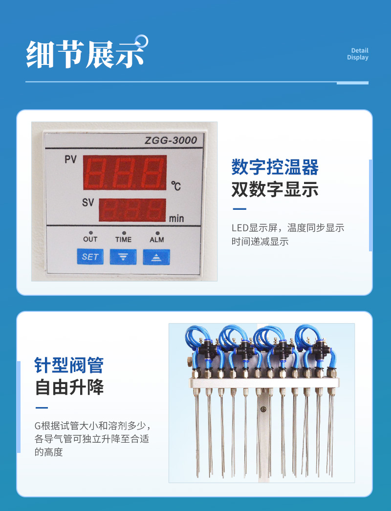 分配室上各氣針通道可組合使用或單獨(dú)使用,每一路氣針均可單獨(dú)開(kāi)關(guān)。分配室的高度可視需要調(diào)節(jié)。每一路氣體流量可單獨(dú)進(jìn)行調(diào)節(jié),克服了不可調(diào)氮吹儀各氣路氣流量大小不一的弱點(diǎn)。數(shù)字溫控器,雙數(shù)字顯示.可能與溶劑接觸的部件均采用不銹鋼材料、合金鋁并表面進(jìn)行塑料噴涂,使用壽命長(zhǎng)且清潔方便。整機(jī)可放入通風(fēng)櫥中使用。一般標(biāo)配的加熱塊規(guī)格為孔徑∮16mm。
