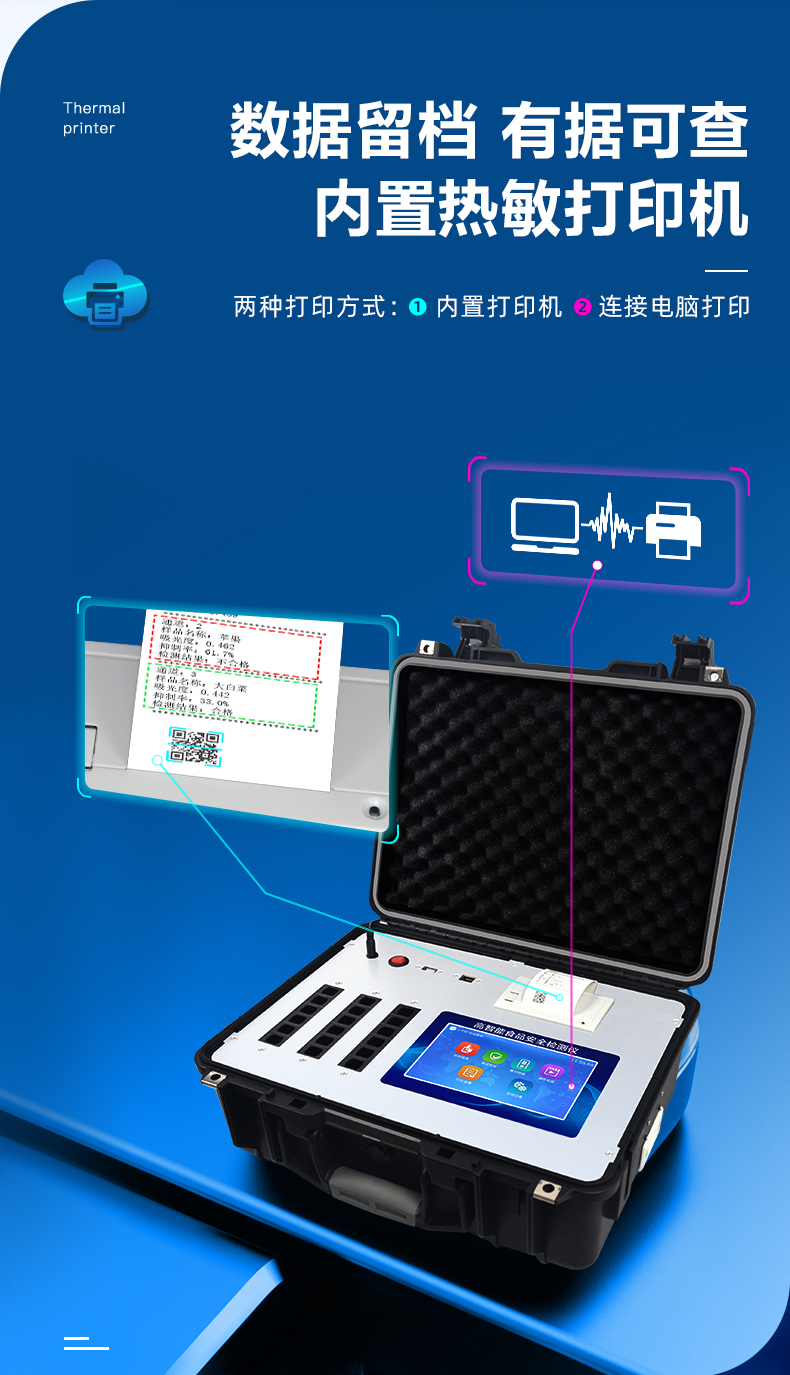 3、新一代高速熱敏打印機,檢測完成可自動打印或批量打印檢測報告和二維碼。