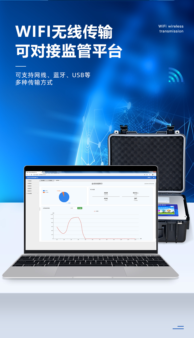 4、儀器帶有監(jiān)管平臺,數(shù)據(jù)可局域網(wǎng)和互聯(lián)網(wǎng)數(shù)據(jù)上傳,檢測結(jié)果直接傳至食品安全監(jiān)管平臺。進行區(qū)域食品安全監(jiān)管及大數(shù)據(jù)分析處理與數(shù)據(jù)統(tǒng)計,檢測區(qū)域食品安全長短期動態(tài),達到食品安全問題預(yù)估、預(yù)警