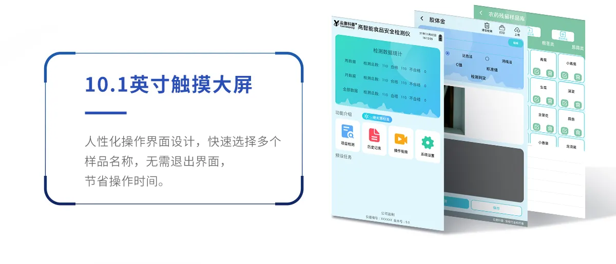 | 儀器采用手提式一體化系統(tǒng)檢測(cè)技術(shù),將分光光度模塊、膠體金檢測(cè)模塊、新型農(nóng)殘檢測(cè)模塊、數(shù)字化管理模塊、無線通訊模塊高度集成于一體,支持檢測(cè)200種食品安全檢測(cè)項(xiàng)目,同時(shí)預(yù)留升級(jí)檢測(cè)方法。 | 儀器檢測(cè)模塊標(biāo)準(zhǔn)化、智能化,檢測(cè)項(xiàng)目可隨意自由組合。檢測(cè)箱體內(nèi)置多個(gè)標(biāo)準(zhǔn)檢測(cè)單元,檢測(cè)模塊可以調(diào)整配置。 | 顯示屏幕:儀器采用10.1英寸豎向液晶觸摸屏顯,搭配運(yùn)行安卓智能操作系統(tǒng),主控芯片采用ARM Cortex-A7,RK3288/4核處理器,主頻1.88Ghz,操作方便,性能更強(qiáng)。 | 檢測(cè)通道:≥12通道;采用精密旋轉(zhuǎn)比色池設(shè)計(jì),使用同芯片同光源校準(zhǔn)精度,解決不同光源之間的誤差值,更加準(zhǔn)確**。(1-12通道間誤差0.1%,***:**202022821055.2) | 儀器光源:高精度進(jìn)口四波長冷光源,每個(gè)通道均配置 410、520、590、630nm 波長光源,標(biāo)配**的光路切換裝置,專利光路切換功能可實(shí)現(xiàn)64波長,并且所有檢測(cè)項(xiàng)目可實(shí)現(xiàn)所有通道同時(shí)檢測(cè)。 | 設(shè)備可一鍵校準(zhǔn),自動(dòng)保存校準(zhǔn)數(shù)據(jù),自動(dòng)對(duì)比校驗(yàn),得到精準(zhǔn)光源,采用Android SP存儲(chǔ)數(shù)據(jù),光源數(shù)據(jù)永不丟失,方便每一次使用。 | 通訊接口:配備無線通信模塊、4G(APN)通訊模塊、藍(lán)牙傳輸,同時(shí)具有雙USB接口以及RJ45網(wǎng)線接口,可以多方式實(shí)現(xiàn)數(shù)據(jù)保存及數(shù)據(jù)傳輸。 | 存儲(chǔ)方式:支持U盤存儲(chǔ),標(biāo)準(zhǔn)USB接口,免驅(qū)動(dòng)安裝。檢測(cè)結(jié)果存儲(chǔ)容量20萬條以上,可生成Excel表格進(jìn)行拷貝,并具有登錄保護(hù)功能。 | 智能化操作系統(tǒng):: ★操作系統(tǒng):儀器可在同一檢測(cè)界面自動(dòng)對(duì)應(yīng)相關(guān)檢測(cè)通道,一次性選擇1-12個(gè)樣品名稱,無需退出界面,節(jié)省操作時(shí)間。并可以對(duì)每個(gè)通道屬性和樣品信息單獨(dú)進(jìn)行編輯,例如送檢單位、人員,檢測(cè)人員等,打印時(shí)勾選打印顯示。 | ★數(shù)據(jù)集成系統(tǒng):設(shè)備首頁自動(dòng)匯總分析檢測(cè)數(shù)據(jù),包含:周檢測(cè)數(shù)據(jù)、月檢測(cè)數(shù)據(jù),全部檢測(cè)總數(shù)量,均包含檢測(cè)總數(shù),合格數(shù),不合格數(shù),以及相關(guān)柱形分析圖,各項(xiàng)檢測(cè)數(shù)據(jù)一目了然,無需電腦查詢,更加快捷直觀。 | ★數(shù)據(jù)庫系統(tǒng):十幾項(xiàng)數(shù)據(jù)庫分類管理儀器:包含項(xiàng)目類型、項(xiàng)目數(shù)據(jù)、檢測(cè)數(shù)據(jù)、歷史記錄、國標(biāo)信息、曲線信息、采樣信息、檢測(cè)信息、受檢信息、復(fù)核信息、圖表信息、光源校準(zhǔn)信息、打印樣式信息、樣品庫信息等等,數(shù)據(jù)庫之間互相協(xié)調(diào)聯(lián)動(dòng)保證數(shù)據(jù)的真實(shí)完整性。同時(shí)產(chǎn)品數(shù)據(jù)庫以及歷史檢測(cè)記錄支持一鍵檢索功能。 | ★限量規(guī)判系統(tǒng):具有限量查詢、添加物質(zhì)合規(guī)判定系統(tǒng)。檢測(cè)出結(jié)果后,系統(tǒng)自動(dòng)調(diào)用系統(tǒng)數(shù)據(jù)庫中相關(guān)國標(biāo)進(jìn)行比對(duì)判定,客觀顯示判定結(jié)果是否合格 | ★項(xiàng)目預(yù)設(shè)系統(tǒng):儀器具有任務(wù)預(yù)設(shè)模塊,一鍵提前預(yù)設(shè),給出方便快捷的新檢測(cè)方案,每一個(gè)任務(wù)分別可以設(shè)置不同的樣品、批次、編號(hào)、來源、備注、抽樣信息、檢測(cè)信息、受檢信息、復(fù)核信息等更多信息。樣品送檢時(shí)一鍵調(diào)取保存信息,并可多次調(diào)取,大大提高檢測(cè)效率。 | ★數(shù)據(jù)監(jiān)管系統(tǒng):同步對(duì)接監(jiān)管平臺(tái),數(shù)據(jù)可局域網(wǎng)和互聯(lián)網(wǎng)數(shù)據(jù)上傳,檢測(cè)結(jié)果可選擇直接傳至食品安全監(jiān)管平臺(tái)。進(jìn)行區(qū)域食品安全監(jiān)管及大數(shù)據(jù)分析處理與數(shù)據(jù)統(tǒng)計(jì),檢測(cè)區(qū)域食品安全長短期動(dòng)態(tài),達(dá)到食品安全問題預(yù)估、預(yù)警。 | ★打印系統(tǒng):內(nèi)置全新打印機(jī),新創(chuàng)自定義打印方式,可按需靈活勾選控制:產(chǎn)品合格證(國家農(nóng)業(yè)部標(biāo)準(zhǔn)要求),二維碼,抽樣信息、檢測(cè)信息,受檢信息、復(fù)核信息、抽樣日期、檢測(cè)日期等信息的打印。 | 供電模式:儀器交直流兩用,直流12V供電,可連接車載電源,可配6ah大容量充電鋰電池,電量可實(shí)時(shí)顯示,方便戶外流動(dòng)測(cè)試。 | 膠體金檢測(cè)模塊:采用雙通道CMOS成像處理技術(shù)及膠體金免疫層析技術(shù),可同時(shí)讀取雙膠體金卡數(shù)據(jù),自動(dòng)采集、處理分析,將檢測(cè)結(jié)果顯示,并可根據(jù)參考限值自動(dòng)判斷檢測(cè)結(jié)果,可檢測(cè)常見的獸藥殘留、生物毒素、抗生素、違禁添加物等。 | ★探測(cè)技術(shù):CMOS成像探測(cè); | ★檢測(cè)通道:1個(gè)通道; | ★檢測(cè)方式:消線法和比色法; | ★顯示模式:陰性或陽性; | ★曲線形式:軌道式掃描方式,顯示金標(biāo)卡圖像,實(shí)時(shí)生成、識(sh