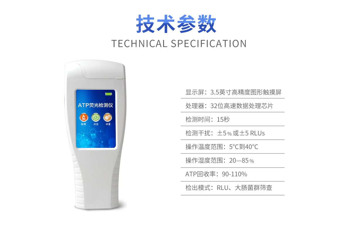 該設(shè)備為全新升級產(chǎn)品,大屏幕觸摸顯示屏,代替?zhèn)鹘y(tǒng)按鍵。操作采用生物化學(xué)反應(yīng)方法檢測ATP含量,ATP熒光檢測儀基于螢火蟲發(fā)光原理,利用“熒光素酶—熒光素體系”快速檢測三磷酸腺苷(ATP)。ATP拭子含有可以裂解細胞膜的試劑,能將細胞內(nèi)ATP釋放出來,與試劑中含有的特異性酶發(fā)生反應(yīng),產(chǎn)生光,再用熒光照度計檢測發(fā)光值,微生物的數(shù)量與發(fā)光值成正比,由于所有生物活細胞中含有恒量的ATP,所以ATP含量可以清晰地表明樣品中微生物與其他生物殘余的多少,用于判斷衛(wèi)生狀況。